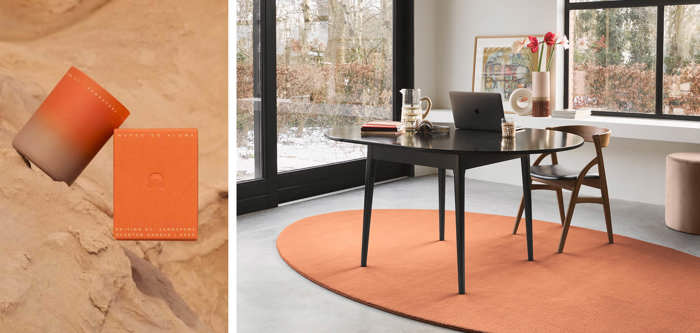 Bron v.l.n.r: kaars Sand van Never Go Alone, vloerkleed op maat DESSO Asteranne 2055